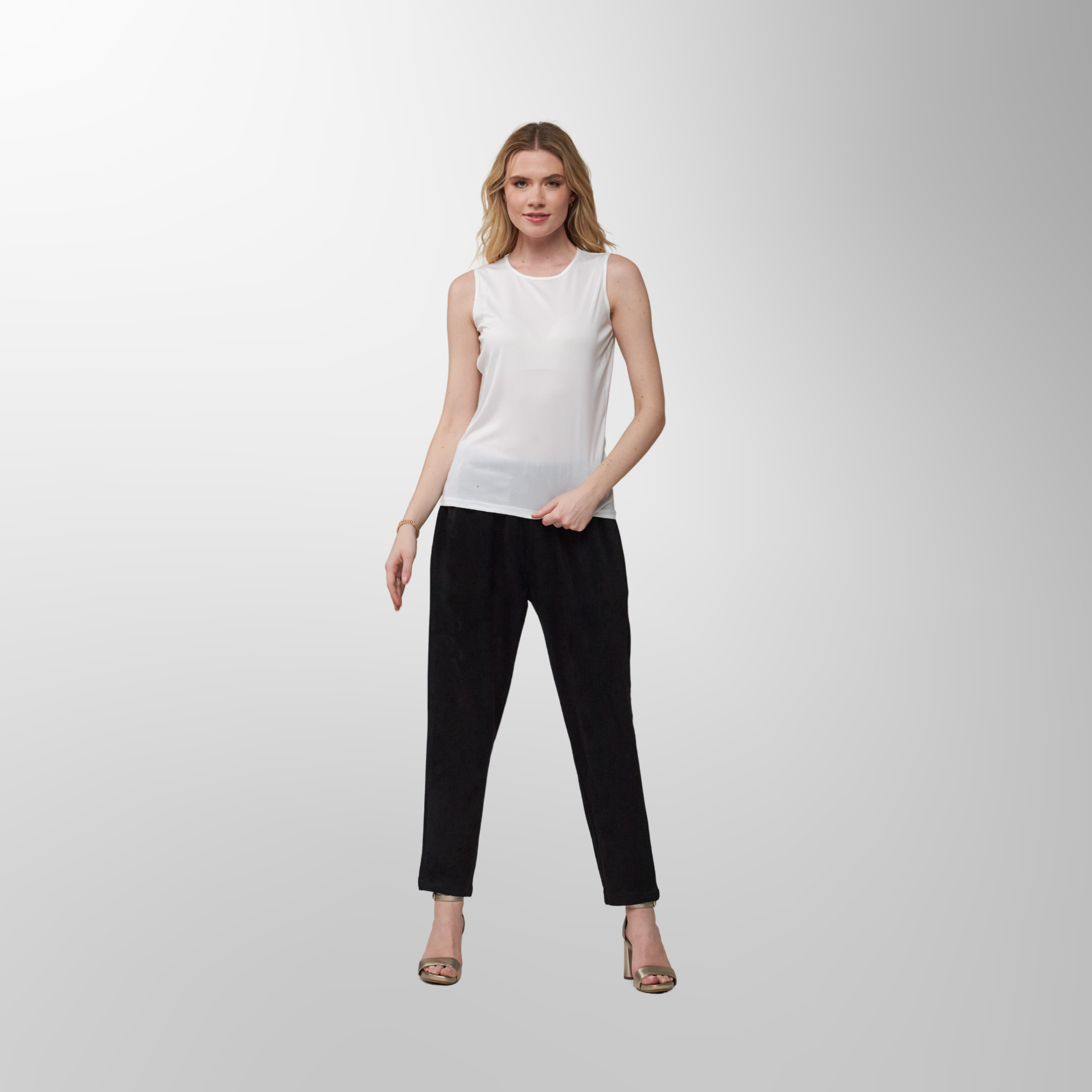 The Hip Length Tank Top offers endless styling possibilities. For a casual weekend look, pair it with jeans and sneakers. To elevate your workwear, layer it under a tailored longline blazer. For travel or lounging, combine it with flowy pants and a light cardigan. Its crisp white tone and minimalist finish make it the perfect foundation for any outfit, offering both comfort and understated elegance.